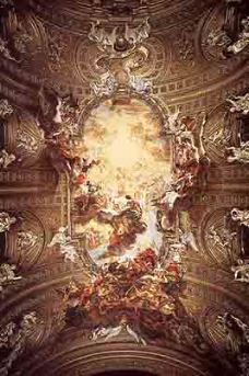 Giovanni Battista Gaulli. Triumph of the Name of Jesus, ceiling fresco with stucco figures in the vault of the Church of Il Gesu, Rome. 1676-79 |